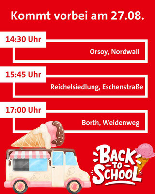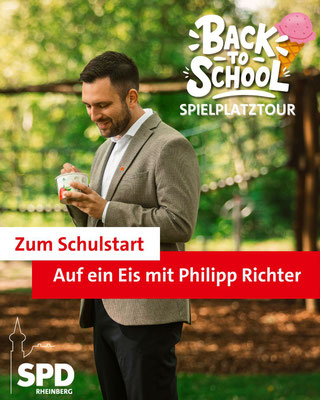 Zum Start ins neue Schuljahr lädt die SPD Rheinberg Kinder, Eltern und Familien herzlich zu einer besonderen Aktion ein: Unter dem Motto „Back to School – Auf ein Eis mit Philipp